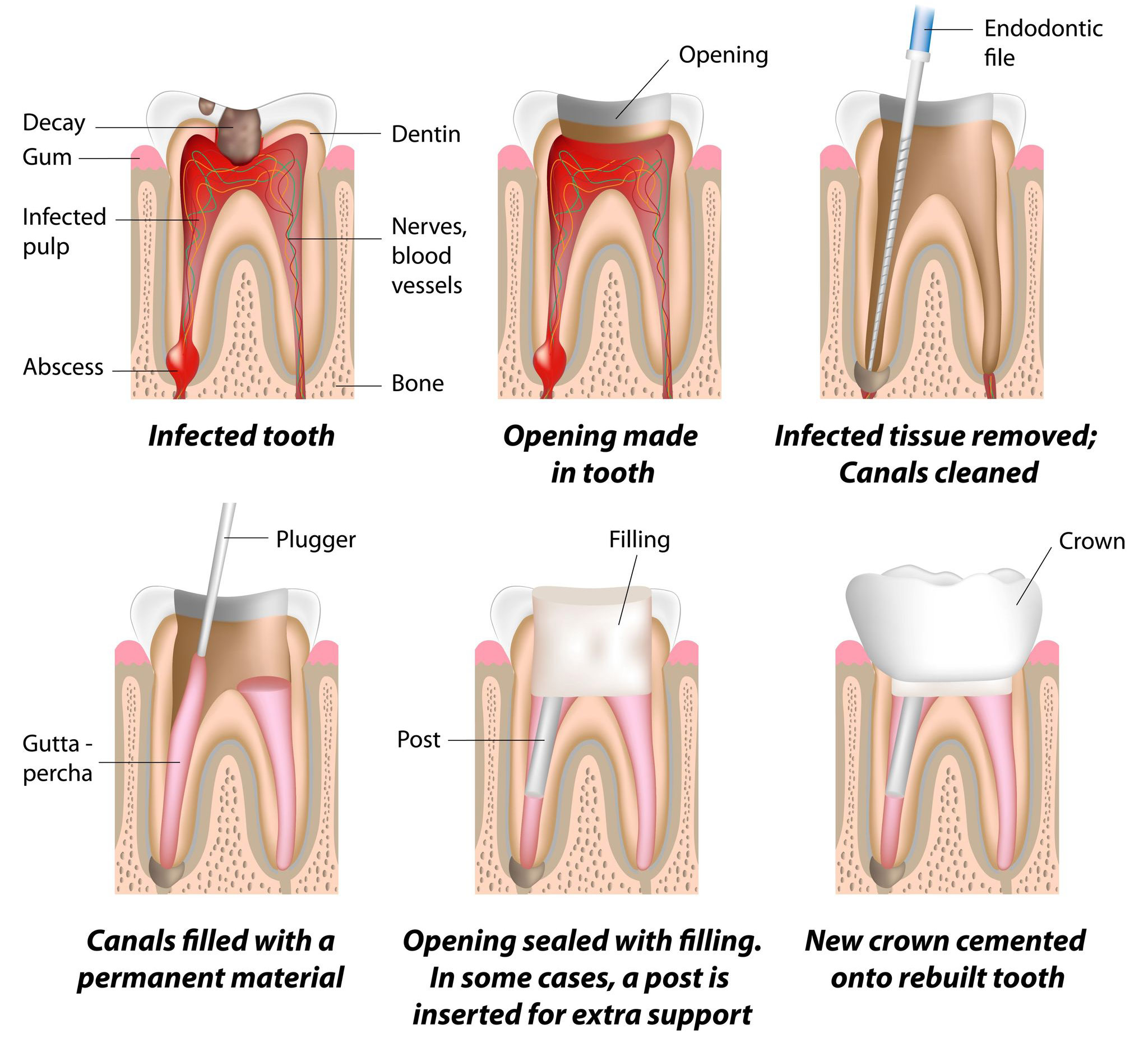 The actual treatment process is relatively straight-forward. Basically, all we are doing is removing the infected dental pulp, cleaning and decontaminating the interior of your tooth, and filling it with a stable dental compound. Depending on the damage to your tooth, we may need to place a dental crown.